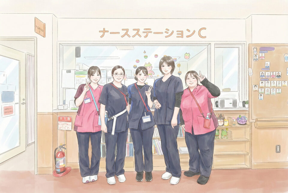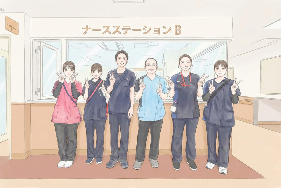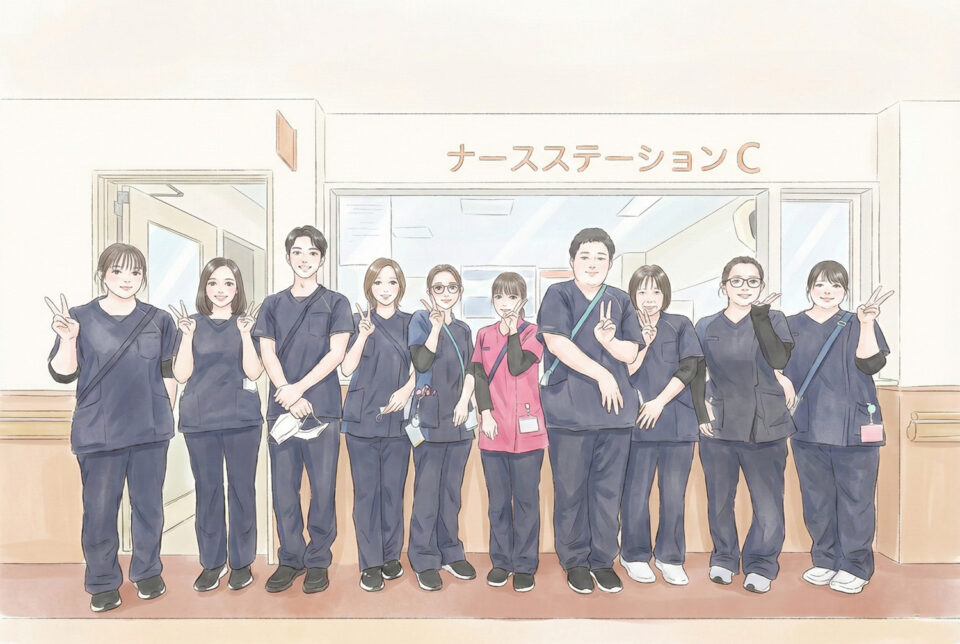 若手からベテラン、子育て中の職員、さらに外国人スタッフまで、多彩なメンバーがそれぞれの強みを活かして活躍しています。明るく活気に満ちた、風通しの良い雰囲気が当病棟の大きな魅力です。