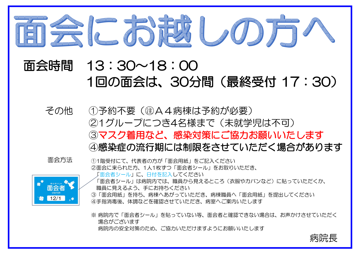 前の記事へ 11.01 2025 診療科・外来 令和7年11月のご案内 外来担当表 11月分の外来担当表を…… 次の記事へ 12.01 2025 診療科・外来 令和7年12月のご案内 外来担当表 12月分の外来担当表を…… お知らせ一覧に戻る 11.30 2025 入院 面会についてのご案内 令和7年12月1日より、入院患者様への面会について以下のように変更いたします。 詳しくは以下のページをご覧ください。 付き添いや面会の方へ